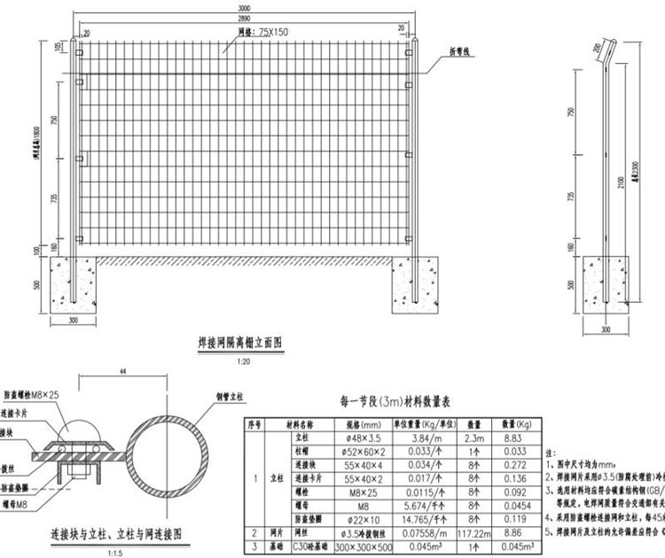 4、焊接網隔離柵采用防盜螺栓連接網和立柱,每45米或轉向處安裝一個斜撐,斜撐為廠家配套生產。