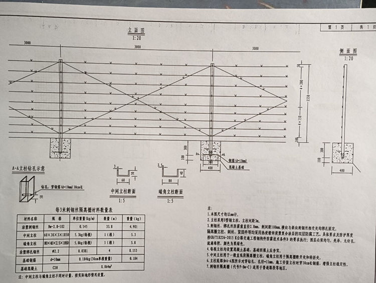 5.中間立柱用于一般直線段隔離柵立柱,墻角立柱用于隔離柵斷開處和轉(zhuǎn)折處。