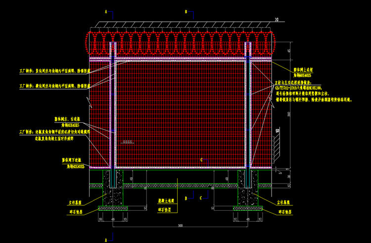 10、圖中立柱頂部應(yīng)加蓋柱帽,立柱與鋼筋網(wǎng)、立柱與斜撐及立柱與延伸臂的連接采用防盜形式并經(jīng)防腐處理。
