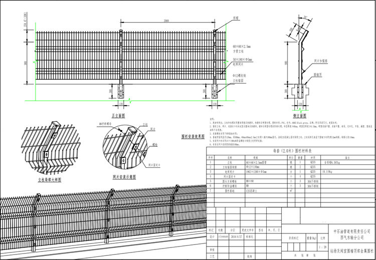 1、折彎式金屬圍欄原材料網(wǎng)絲;立柱和柱帽采用整體焊接后熱鍍鋅,熱鍍鋅后噴塑處理。塑粉材質(zhì):PVC,色號(hào):6005 Black green。