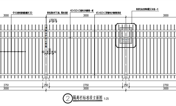 2.隔離護(hù)欄工廠加工好格柵片,鋼柱焊于基礎(chǔ)后,格柵橫梁連接于鋼柱上。