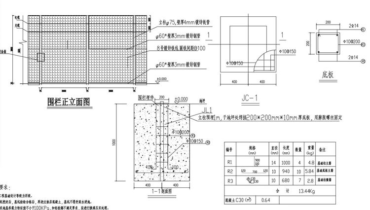 3、熱鍍鋅圍欄基礎(chǔ)鋼筋籠底板主筋采用Φ10@150,基礎(chǔ)鋼筋籠縱向主筋采用Φ10@150,基礎(chǔ)鋼筋籠箍筋采用Φ 10@200。