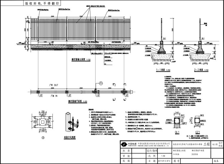 6.柵欄圍墻基礎(chǔ)當(dāng)填土深度>500時(shí),基礎(chǔ)應(yīng)相應(yīng)加深。基礎(chǔ)地壓力不小于10T,如遇不良地基,需換土處理。