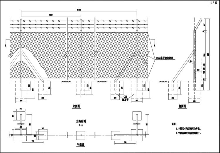 2.勾花網(wǎng)護欄網(wǎng)沿公路用地界布置,立柱在用地界內側25cm處。
