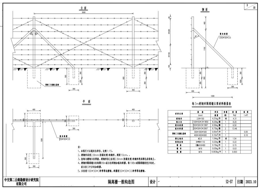 4、刺鋼絲隔離柵立柱每隔99m在立柱兩側(cè)加縱向斜撐,每198m或隔離柵改變方向處在立柱三個(gè)方向加斜撐。