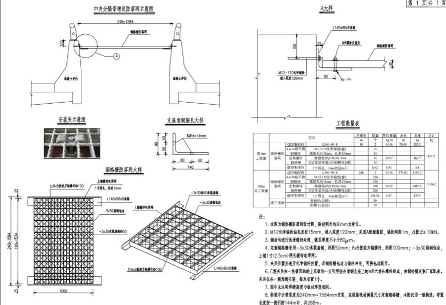 8.橋梁中分帶寬度為240mm~1584mm變寬,應(yīng)根據(jù)現(xiàn)場(chǎng)測(cè)量尺寸定制鋼格柵,本圖僅為一般構(gòu)造,布置長(zhǎng)度按一側(cè)引橋144m計(jì),共288m。