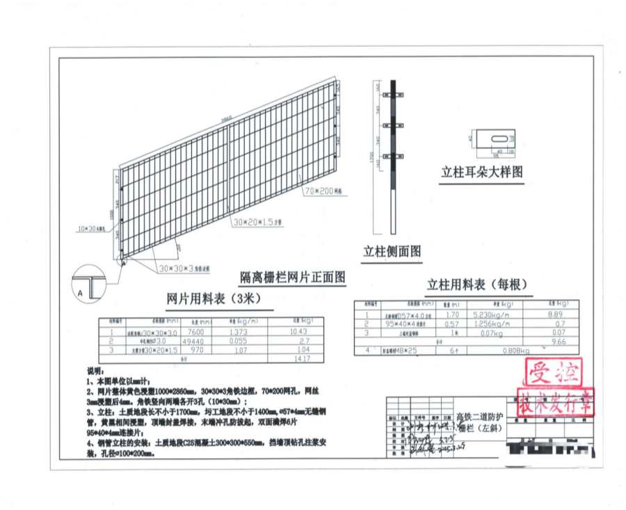3、立柱:土質(zhì)地段長不小于1700mm,圬地段不小于1400mm,φ57*4mm無縫鋼管,黃黑相間漫塑,頂端封蓋焊接,末端沖孔防拔起,雙面滿焊6片95*40*4mm連接片。