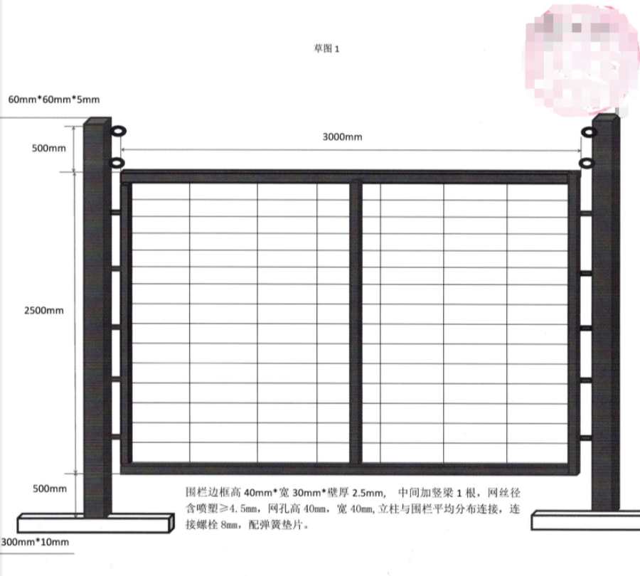 2.活動(dòng)圍欄具體規(guī)格3000mmX2500mm(寬1500mm 處加裝豎梁一根),圍欄孔徑40mmX40mm,鋼絲噴塑后不小于4.5mm,圍欄四周方鋼邊框尺寸為 30mmX40mmX2.5mm(40mm 為邊框正面高度)。(見(jiàn)草圖 1)