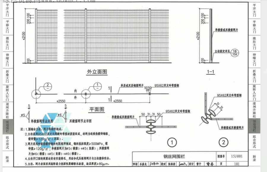 3.網(wǎng)片采用冷拔熱鍍鋅鋼絲電阻熔焊制成,鋼絲抗拉強度>500MPa,鍍鋅量>120g/㎡;單橫筋網(wǎng)片為φ5(橫筋)+φ5(堅筋);雙橫筋網(wǎng)片為φ6(橫筋)+φ5(豎筋)+φ6(橫筋)。