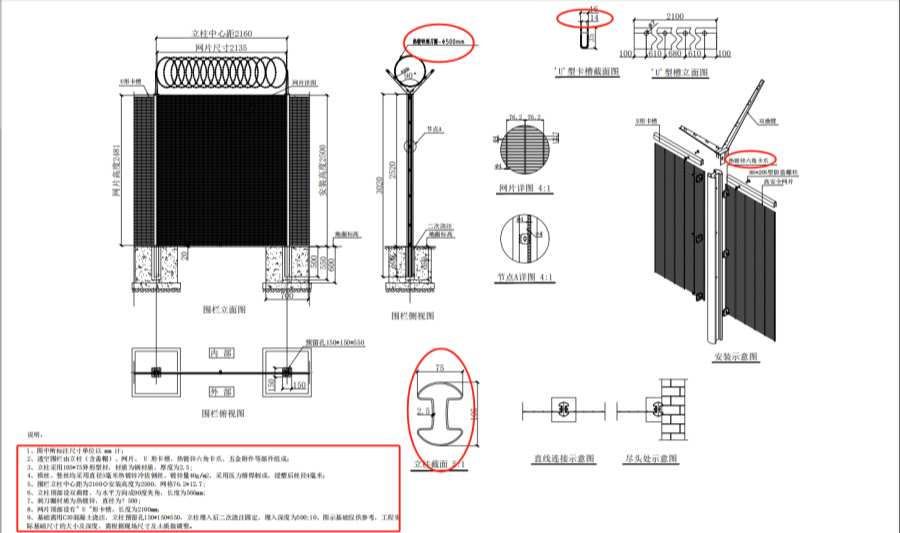 (2)圍欄立柱中心距為2160mm,安裝高度為2500mm,網(wǎng)格為76.2*12.7mm,立柱頂部設(shè)雙曲臂,與水平方向成90°夾角,長度為566mm,表面熱鍍鋅,鍍鋅量>275g/㎡,刺刀圈材質(zhì)為熱鍍鋅鋼,直徑為φ500mm。